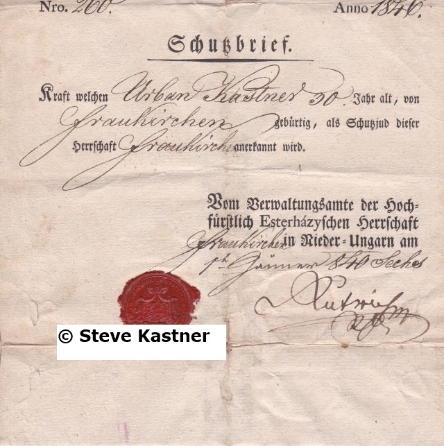 Der Verein „Initiative Erinnern Frauenkirchen“ erhielt von Steven David Kastner aus Kanada die Kopie des „Schutzbriefes“ von Urban Kastner aus dem Jahre 1846. Dieser Schutzbrief erlaubte dem Juden Urban Kastner, sich auch außerhalb von Frauenkirchen frei zu bewegen und seiner Tätigkeit nachzugehen.