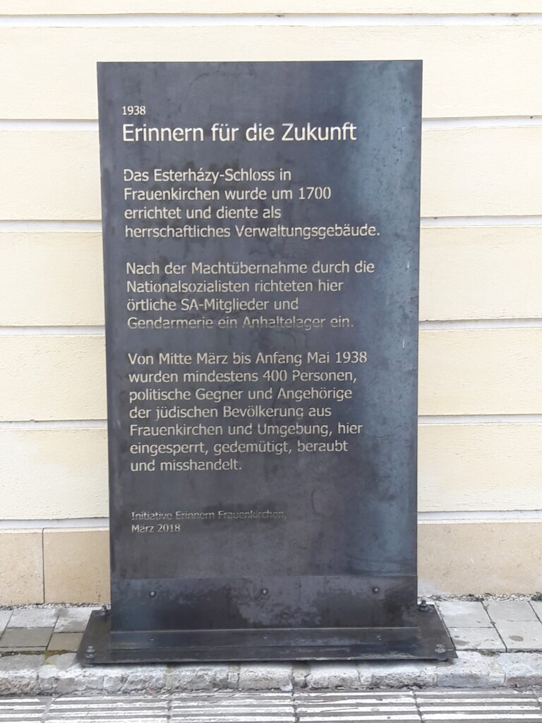 Noch am Abend des 11. März, einen Tag vor dem Einmarsch der Deutschen Wehrmacht in Österreich, übernahmen die Nationalsozialisten im Burgenland, und so auch in Frauenkirchen, die Macht. An diesem Abend begann auch der Terror gegenüber der jüdischen Bevölkerung. Im ehemaligen Gebäude der esterházyschen Gutsverwaltung wurde von den örtlichen Nationalsozialisten ein „Anhaltelager“ eingerichtet. Von Mitte März bis Anfang Mai wurden darin rund 400 Personen, politische Gegner und Angehörige der jüdischen Bevölkerung aus Frauenkirchen und Umgebung, von der SA und Gendarmerie festgehalten, gedemütigt und geschlagen. Alice György, die Tochter des jüdischen Gemeindearztes Johann György gab im Zuge des Volksgerichtsprozesses 1947 bezüglich der Gewaltakte im Lager zu Protokoll: „[…] Mein Vater wurde hierauf unter Beschimpfungen zum Gebäude des Meierhofes gebracht, wo unter menschenunwürdigen Umständen in einem niedrigen Raum bereits eine größere Anzahl von Juden zusammengezwengt [sic!] beisammenstanden. […] Die zwischendurch eingesperrten Juden wurden von Frauenkirchener SA-Leuten und fremden SS aufs ärgste mißhandelt und geschlagen.“